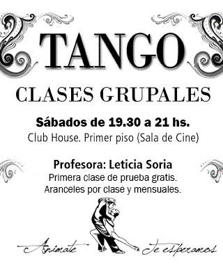 Acercate a probar una nueva actividad... ¡o perfeccionar tus destrezas! Las clases de tango dictadas por la profesora Leticia Soria son todos los sábados de 19.30 a 21 horas en el primer piso del Club House (Sala de Cine).