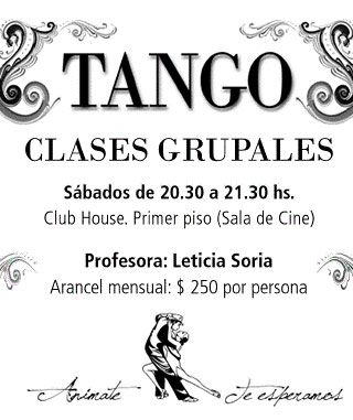 Todos los sábados de 20.30 a 21.30 horas en el primer piso del Club House (Sala de Cine),la profesora Leticia Soria te espera para tomar clases de tango.