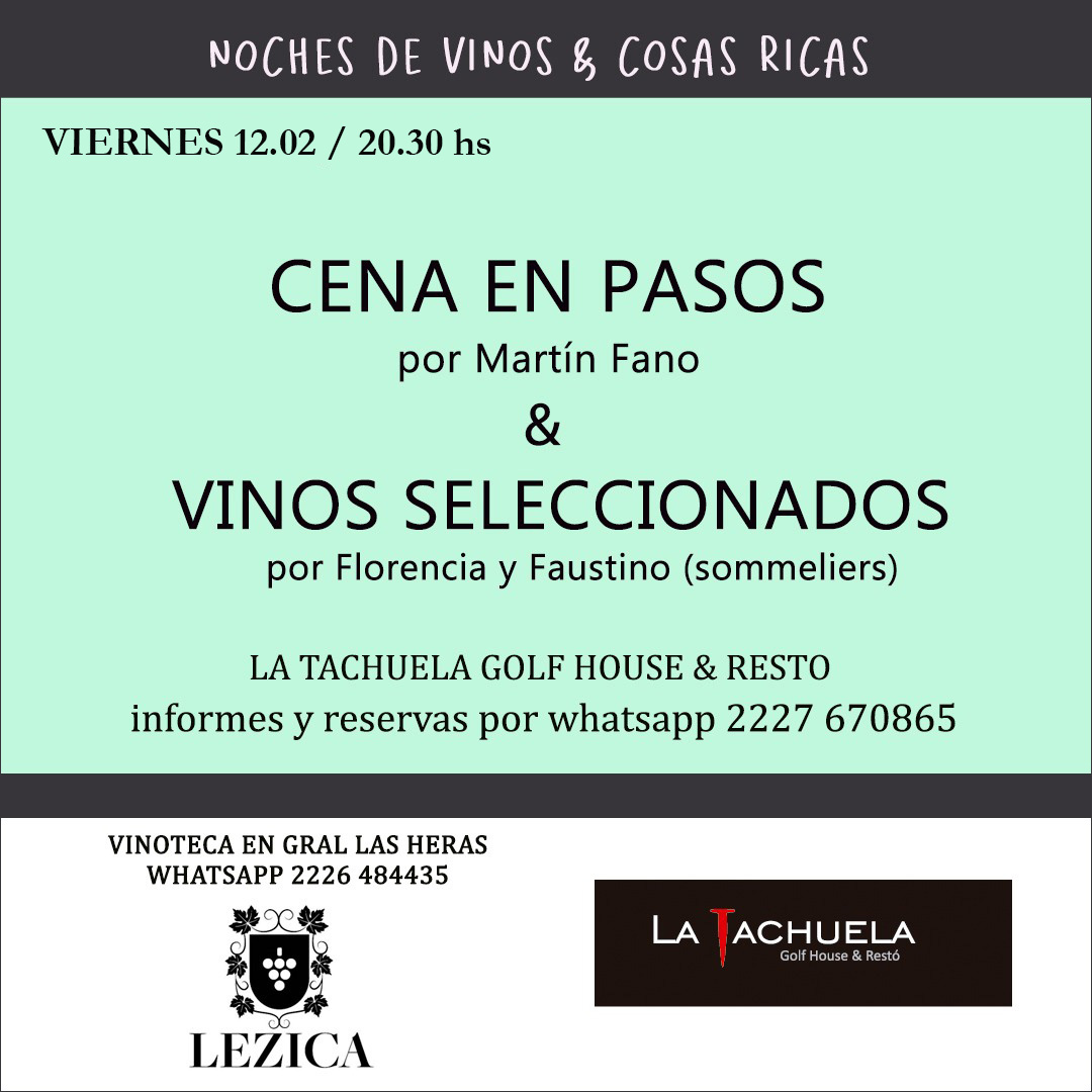 El restaurante La Tachuela y la Vinoteca Lezica de General Las Heras continúan organizando sus noches de cena & vinos selectos en el golf: el próximo encuentro fue reprogramado para el viernes 12 de febrero, a las 20.30 horas.